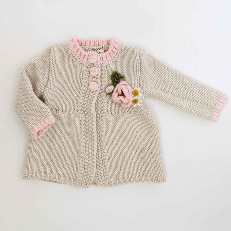 This stunning swing-style sweater is knit in natural hued yarn and embellished with beautiful mohair poppy blossoms. It has soft yarn button closures and is edged in matching light pink yarn. The matching knit bonnet you see here is available separately.