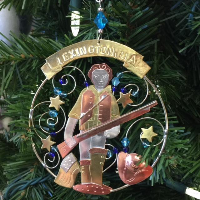 Custom designed and handmade for our shop! Commemorative ornament features the famous statue of Captain Parker on the historic Lexington, MA battle green.