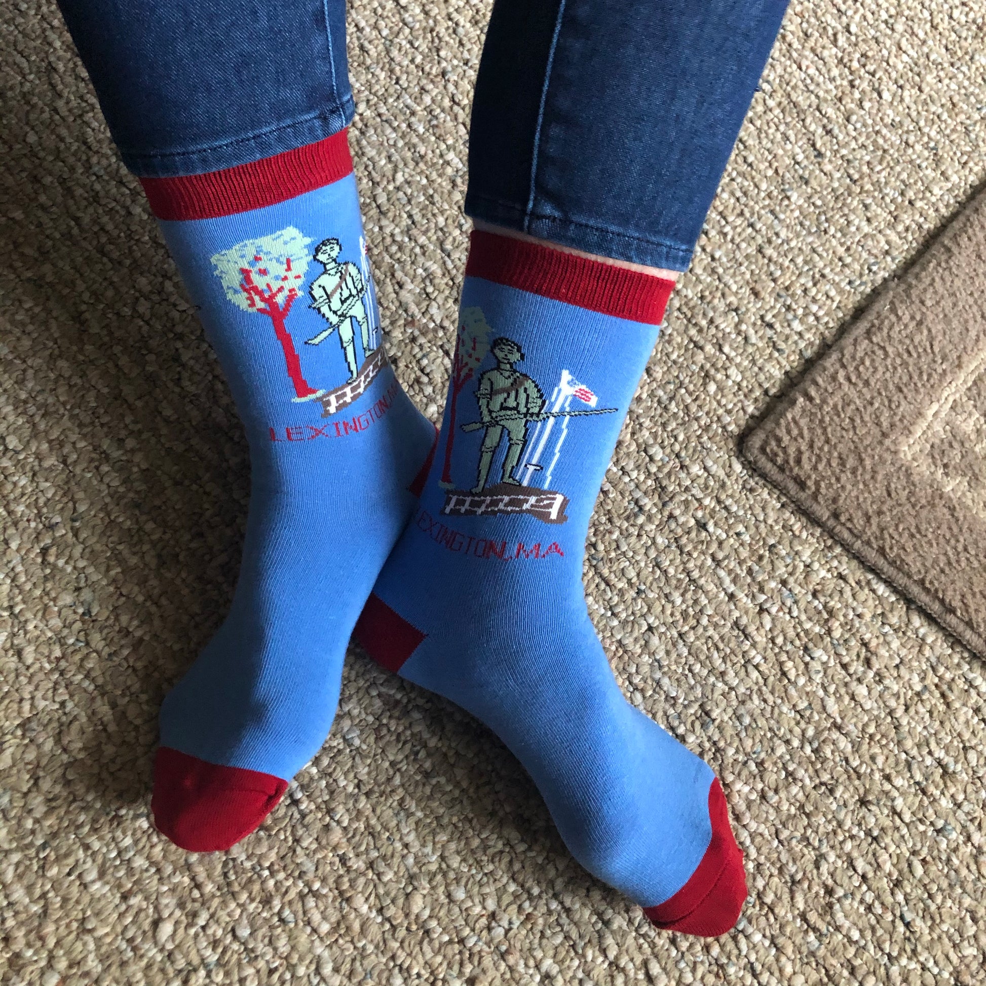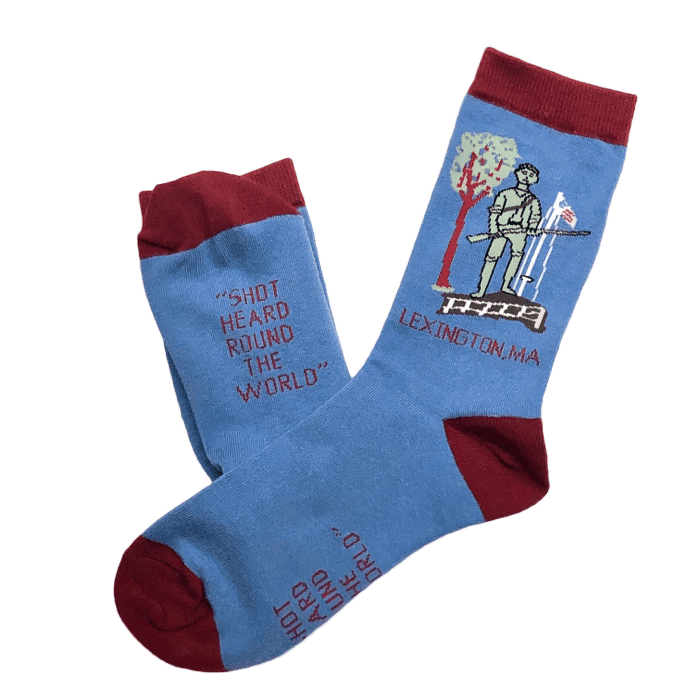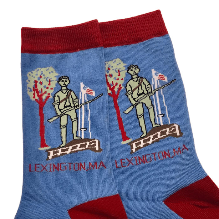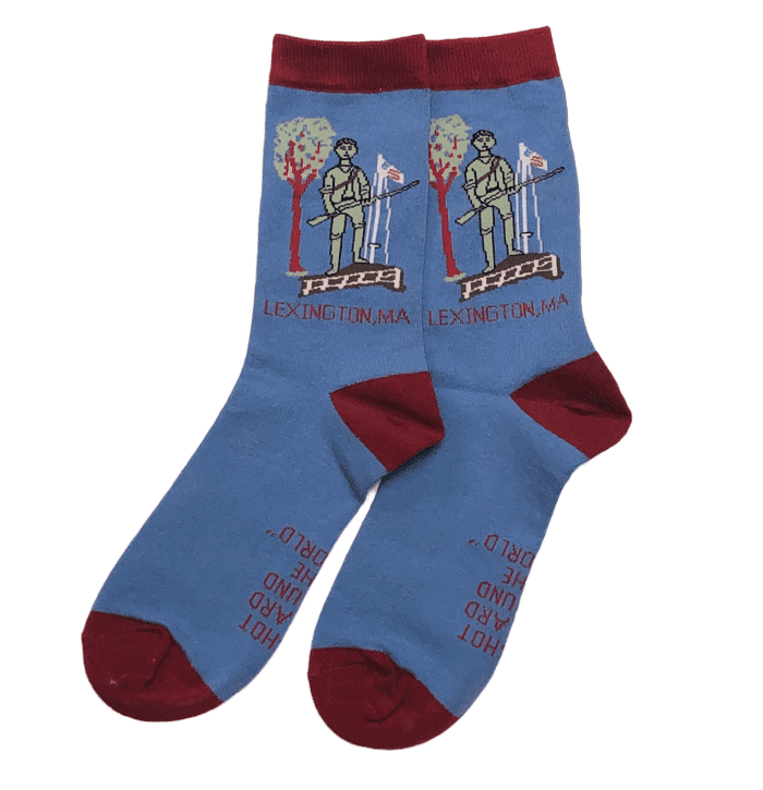 Custom made for our store, this handsome design is of the famous Captain Parker Minuteman statue. A special remembrance and any Lexingtonian would be proud to show off these fun socks.
