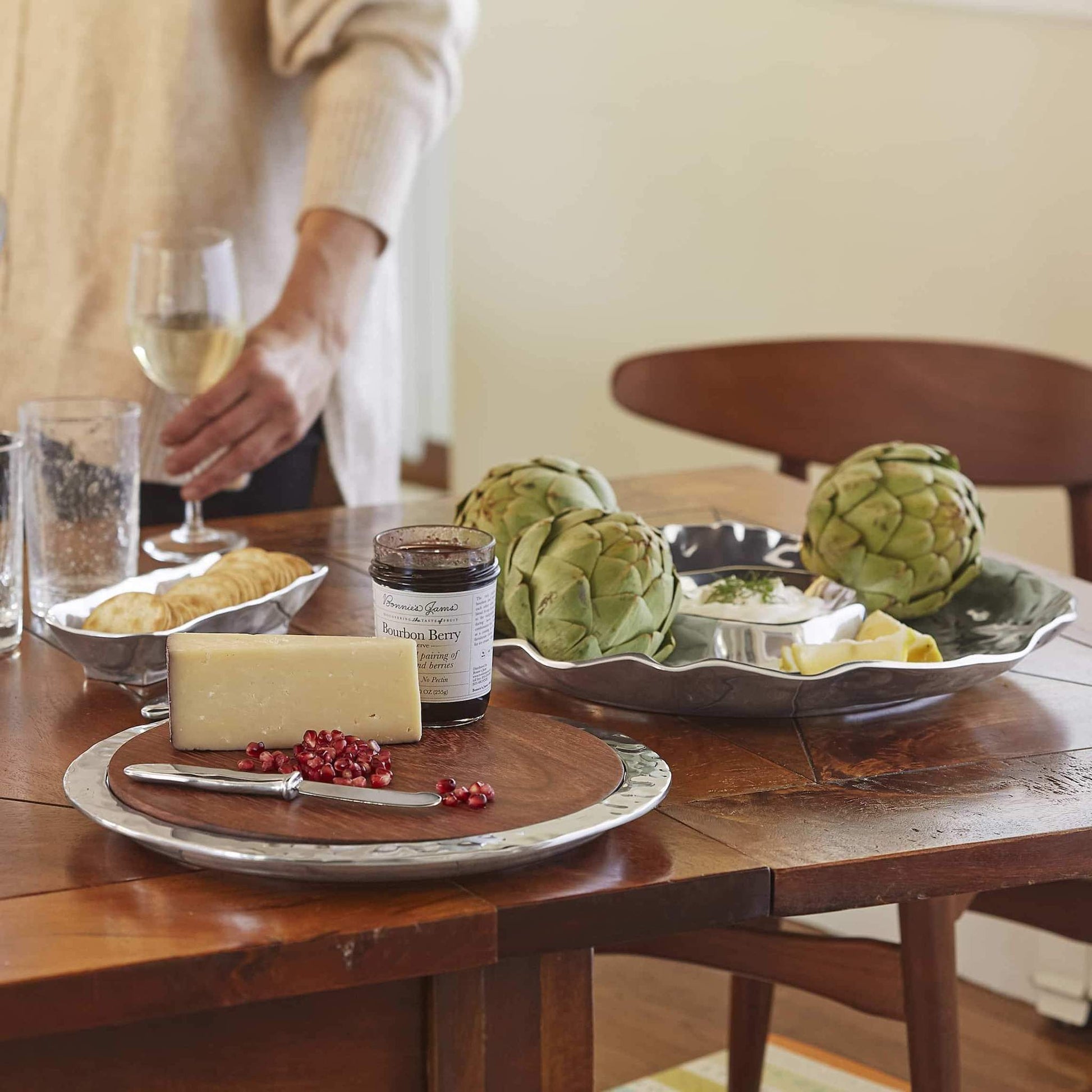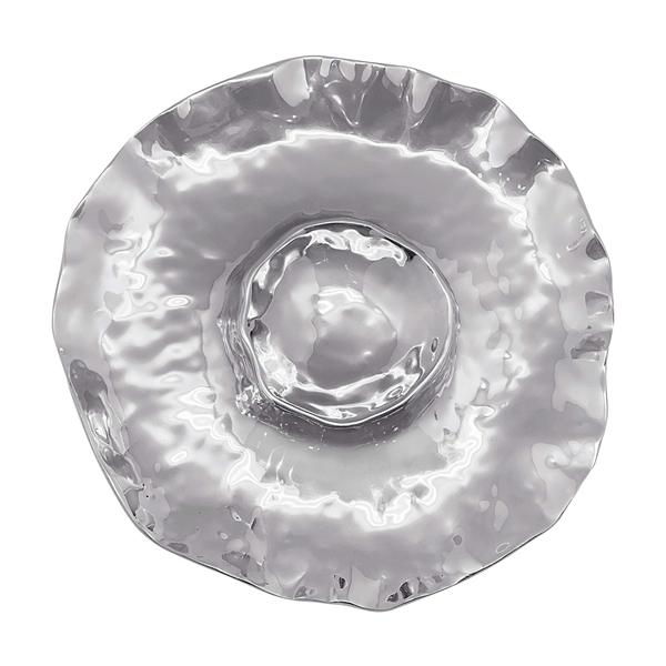 Bring Shimmer to your entertaining table with this distinctive round chip and dip server. Stun your guests with this 15" dish's texture inspired by gentle waves, crafted in 100% recycled, buffed-until-brilliant aluminum.