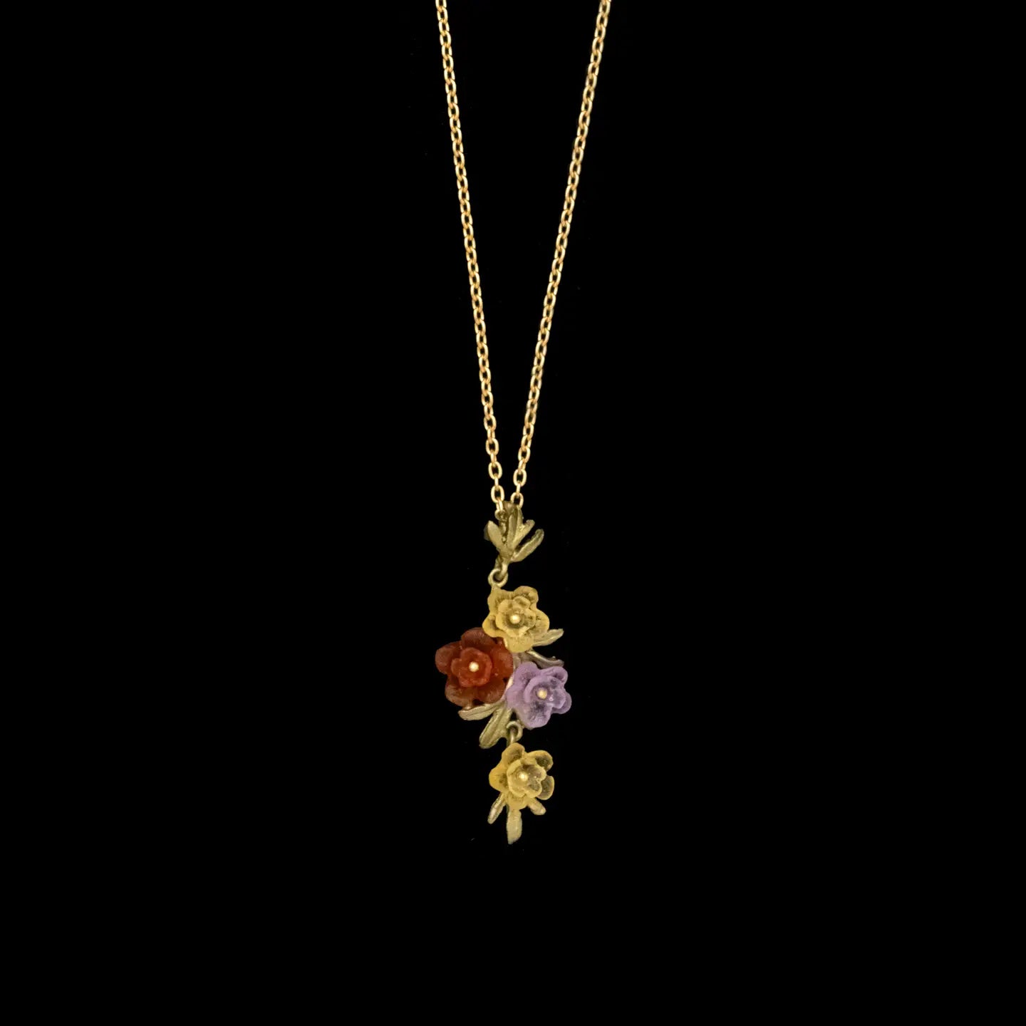 Materials: The Chrysanthemum pendant is cast in hand patinated bronze and accented with yellow, purple and red cast glass flowers.
